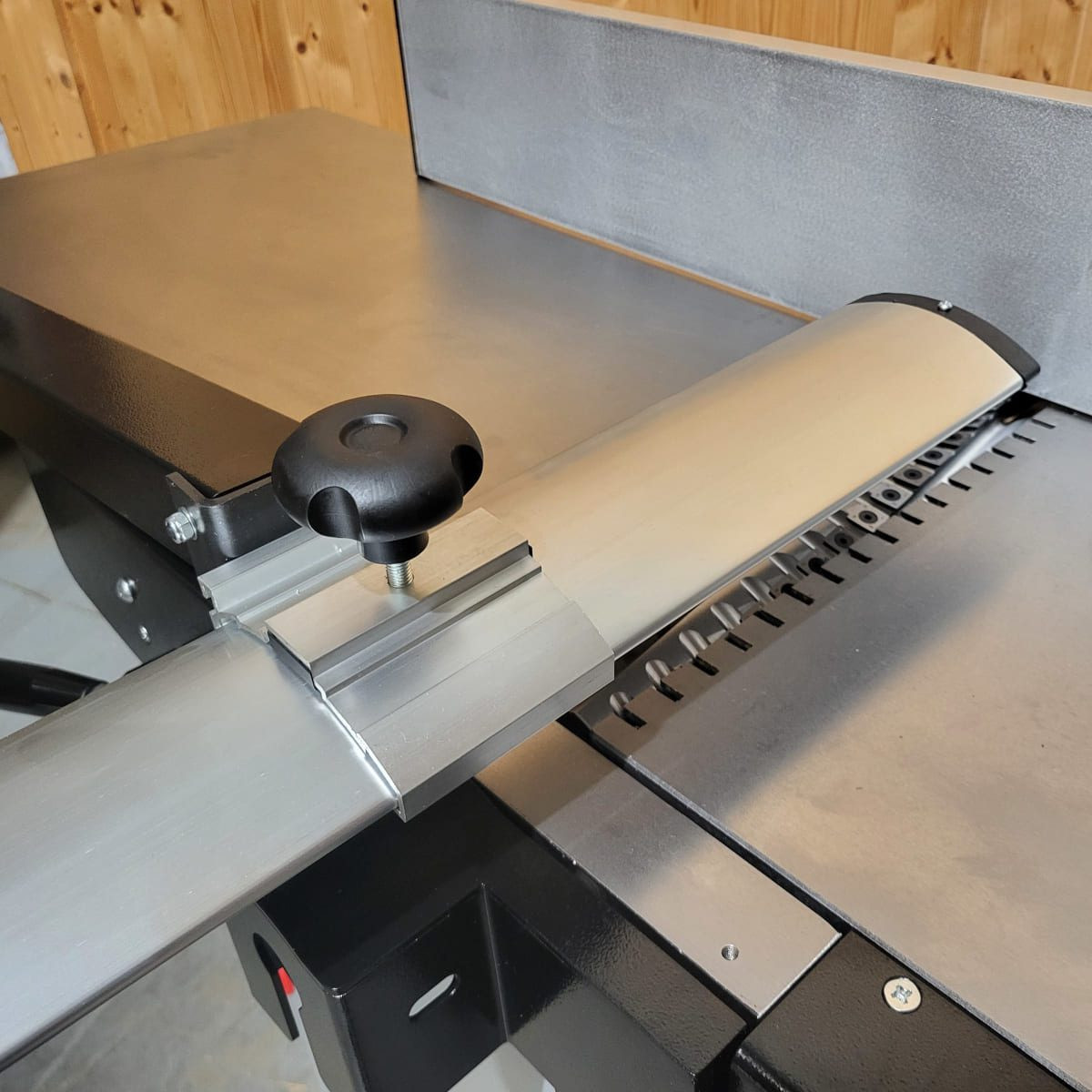 The extra long cast iron infeed bed is quick to adjust using a lever, with a clear scale to read the setting before locking the position. The bridge guard has simple controls to set the height over the cutters and the gap to the side fence. It can also be lifted up and locked completely out of the way. The side fence is mounted on a sturdy cast iron support bracket. The fence can be positioned anywhere across the width of the cutter block, useful for getting even wear on the cutters when working mainly with narrower materials. The fence can also be tilted back to 45 degrees.