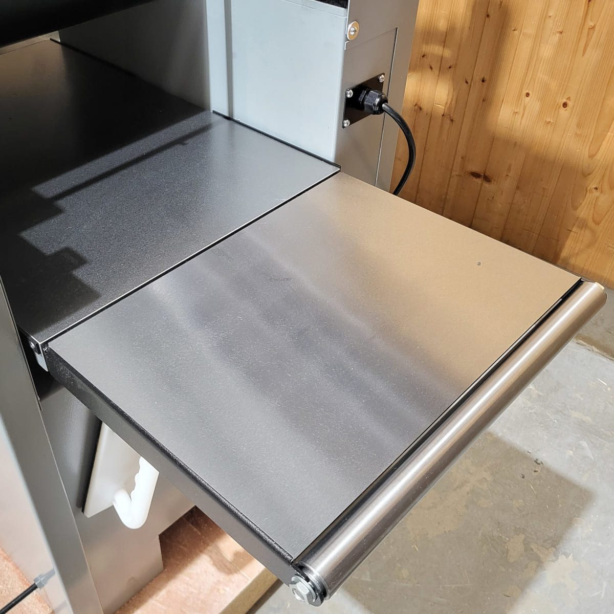 Moving from the Planing function to Thicknessing takes only seconds. Lift the beds then swing the cutter guard over the top. The cutter guard has a 100mm diameter outlet for dust and chip collection.