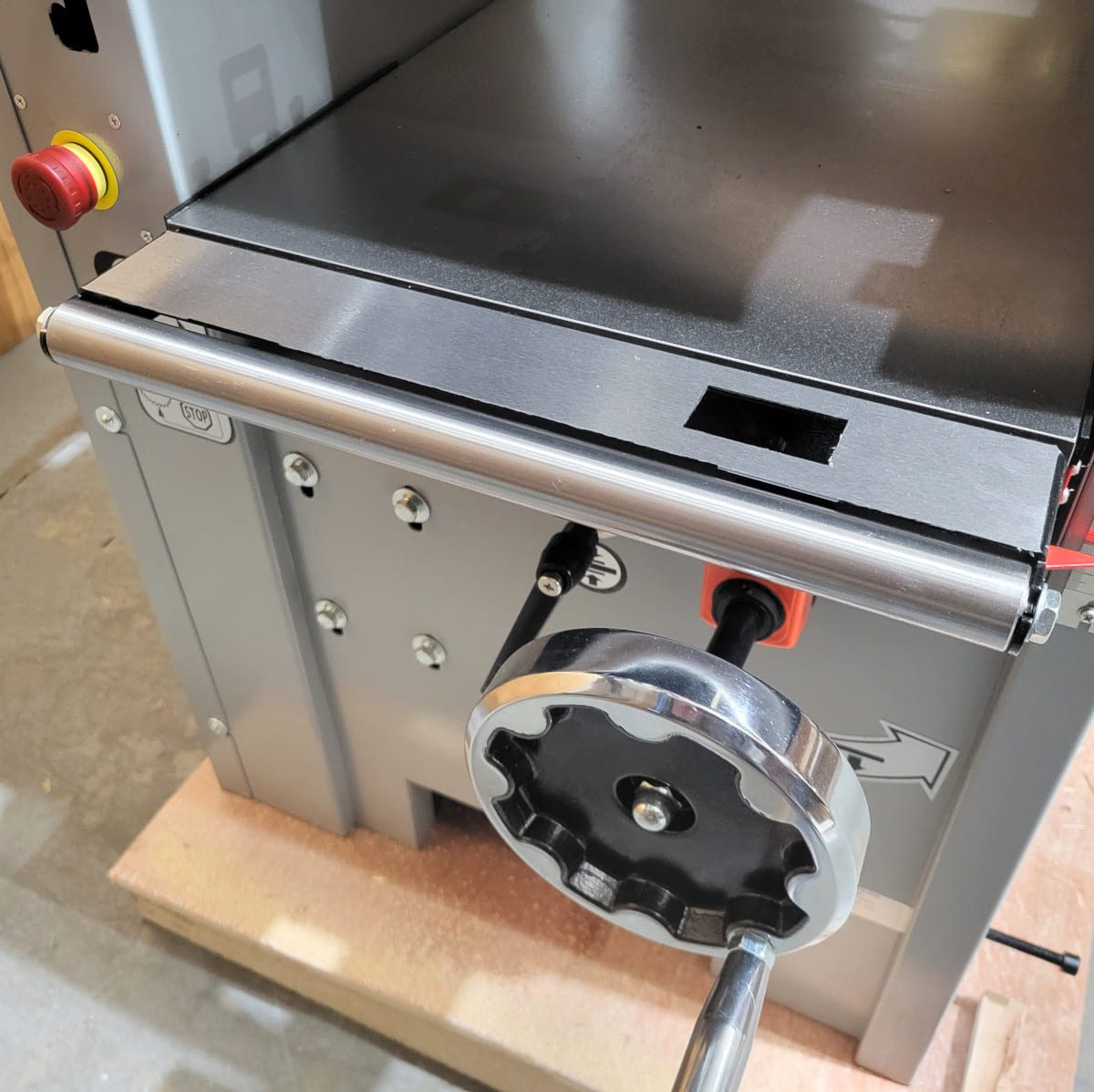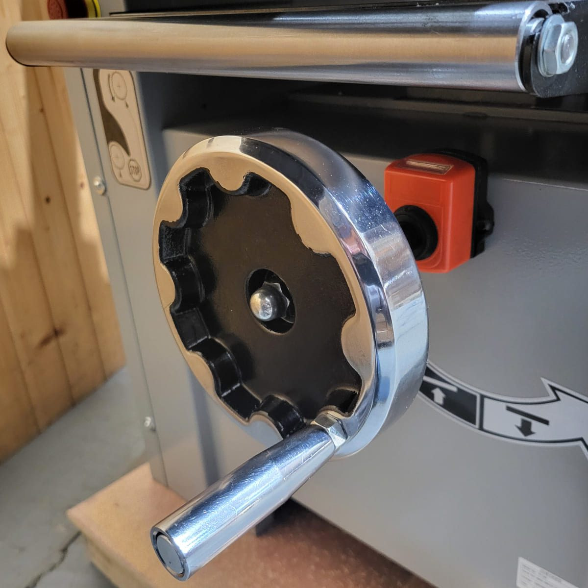 Setting the thicknessing depth is done by rotating the cast iron hand wheel (1 rotation = 2mm) and reading from the measuring scale or for more precise control the mechanical digital display, accurate to 1/10th of a millimetre. A position lock is fitted which prevents any movement of the bed during the cut.