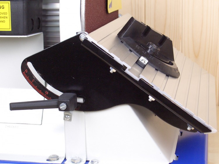The strength and rigidity of the work table is a particularly good feature of this design. Made of extruded aluminium, it is hinged at both ends and is adjustable from +10 degrees to minus 45 degrees. A sliding mitre fence allows angled pieces to be finished and is adjustable 60 degrees left & right.