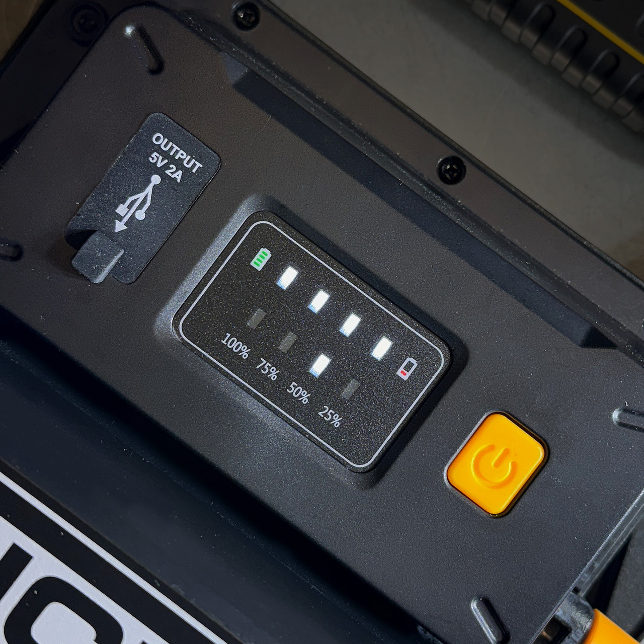 Powerful and robust 4500 lumens site light “Powered Your Way”, using your 18V power tool battery. Built for the construction and allied industries, it has a strong diecast aluminium body with 4 light settings 25%, 50%, 75%, 100%. Besides its immense runtime, it has a brightness and battery status indicator, is tripod mountable, a built-in USB power bank and is has an IP65 (water / dustproof) rating. It comes complete with 5 battery connectors for JCB, Bosch, Makita, DeWalt / Milwaukee and Metabo/Hikoki / CAS 18V